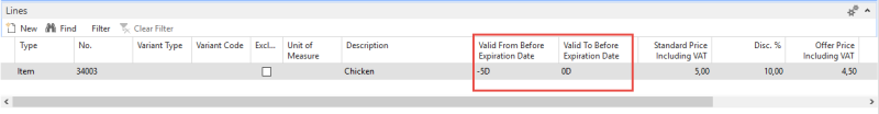 The Valid From Before Expiration Date and Valid To Before Expiration Date fields in the Lines FastTab are DateFormula fields, which means that if they are filled in, the discount in the line is only active during the period before the Expiration Date of the Item being sold.