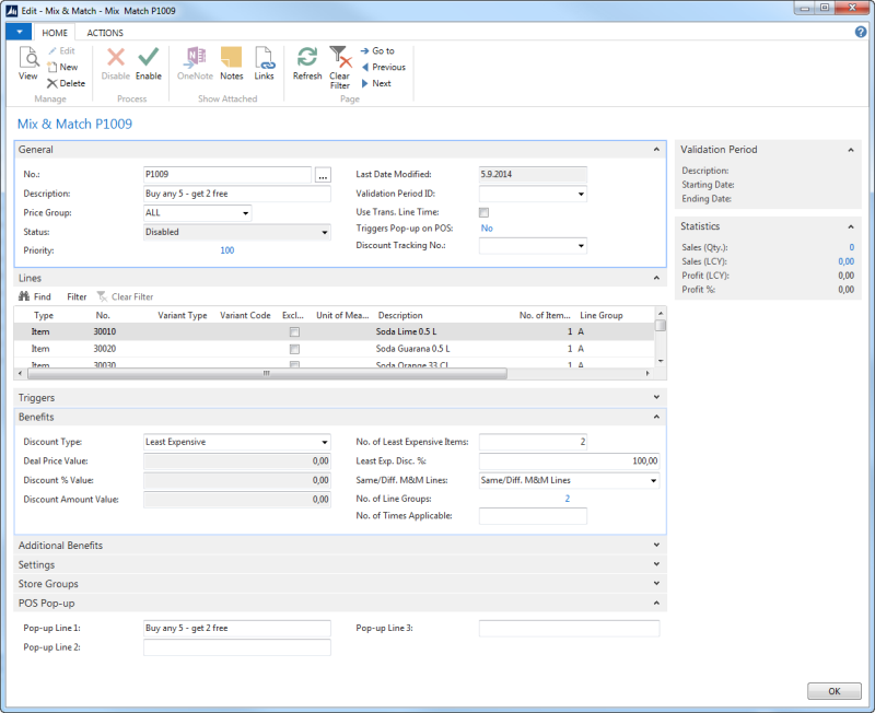 The Mix & Match 0ffers make it possible to combine different items into specially created offers. This can, for example, be a discount if you select 3 different items from 3 selected Retail Product Groups, a discount on a defined number of DVD disks if you buy a DVD player, and several other possibilities.