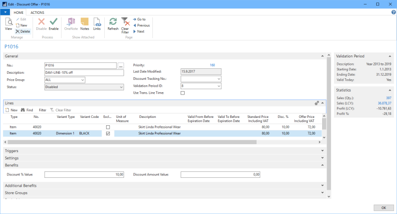On the Benefits FastTab you can enter the same discount percentage or the same discount amount for all items that are entered in lines. This figure will also be used as the default for new items. You can edit each line separately with different amounts.