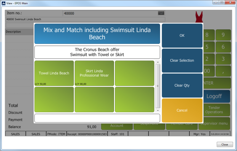 In this example a pop-up window is added to a Mix & Match offer. The offer includes item no. 40000 - Swimsuit Linda Beach as a main item and items 40010 - Towel Liz Beach and 40020 - Skirt Linda Professional Wear. Note that all lines must have the Type Item. The setup for the Mix & Match Line Group has two line groups, A and B and the value 1 in both of them. This means that you have to buy one item in group A and one item in group B to trigger the Mix & Match Offer. Both item no. 40010 and 40020 are in group B, so you can chose between either one of them to trigger the Mix & Match Offer combined with item 40000 on the POS.