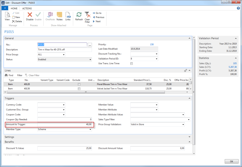In this example the amount 40 is entered in the Amount to Trigger field on a Discount Offer. This means that you must buy items for 40 or more to trigger this Discount Offer on the POS and get a 25% discount.